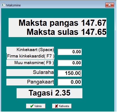 Kõigepealt kuvatakse maksmise aknas müüjale ja kliendile infoks  2 summat : „Maksta pangas“ (ümardamata) ja „Maksta sulas“ (ümardatud ! ).